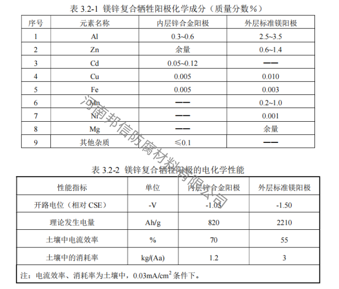 河南邦信鎂鋅復(fù)合陽極外層鎂陽極和內(nèi)部鋅陽極接觸電阻應(yīng)低于 0.001Ω。鎂鋅復(fù)合陽極內(nèi)部Φ12