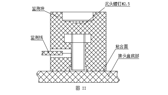 4.2.4 完成芯線與監(jiān)測塊的連接。將與監(jiān)測塊相連的芯線外護層剝開約5mm,然后分別穿入 兩個監(jiān)測塊的¢1.4mm 孔中,并保證剝開部分不露在監(jiān)測塊外。然后將 M2.5 沉頭螺釘擰入 監(jiān)測塊,壓緊芯線,最后,將兩監(jiān)測塊用 502 粘合劑粘結(jié)在接頭盒底部,兩監(jiān)測塊中心距 不大于 20mm。見圖 I、圖 II。